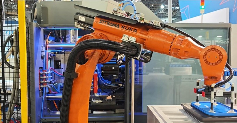 "Showcasing sandwich molding using recycled material for the core layer, automation with robots, AI-based quality inspection, and non-contact transfer."